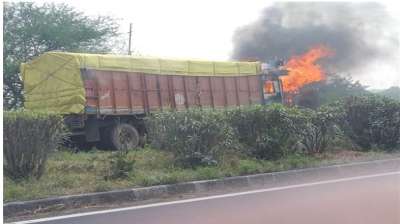 चलते ट्रक में भड़की आग, ड्राइवर और क्लीनर ने जान जोखिम में डालकर बचाई जान