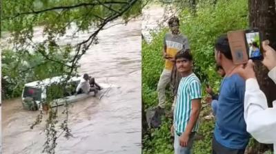 बारिश में उफनाई नदी बनी कहर—मेडिकल ऑफिसर्स की सरकारी गाड़ी बहाव में बही, खजूर में अटकने से बची जान”