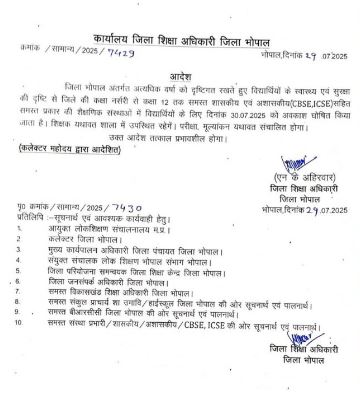 भोपालl में 30 जुलाई को 12वीं तक सभी स्कूल बंद, लगातार बारिश के कारण कलेक्टर ने आदेश जारी किए