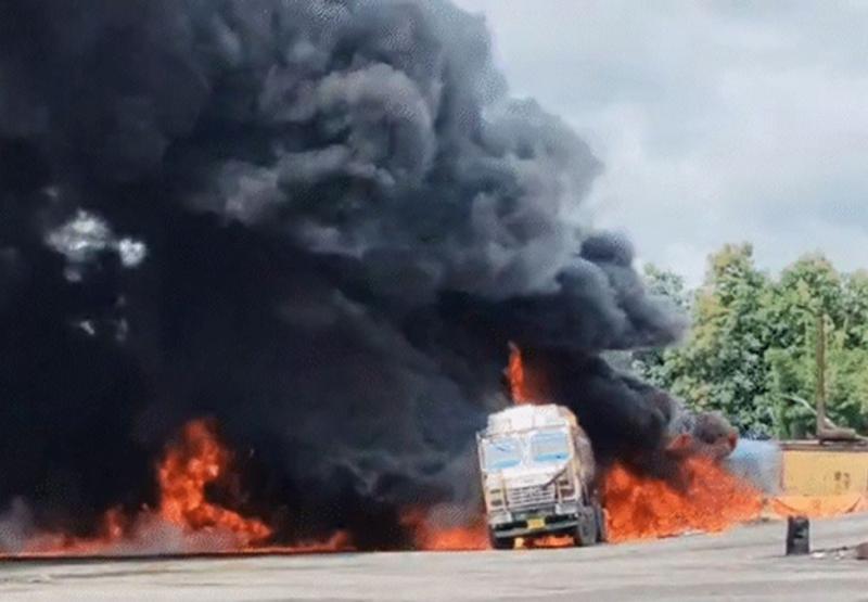 अलकतरा टैंकर आग की लपटों में समाया देखते ही देखते वाहन पूरी तरह जलकर राख
