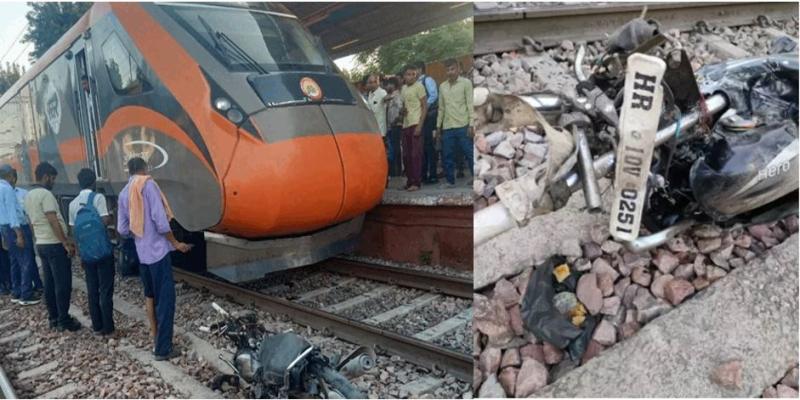 वंदे भारत ट्रेन और बाइक सवार के बीच टकराव टला, यात्रियों को झटका लगते ही हड़कंप मच गया