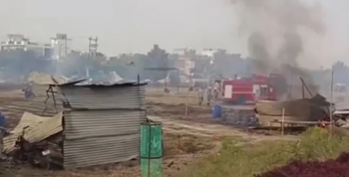 पटाखा बाजार में लगी भीषण आग, 60 से अधिक दुकानें जली, कई दुकानदार भी झुलसे