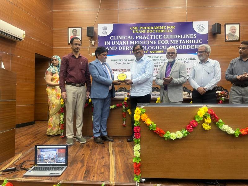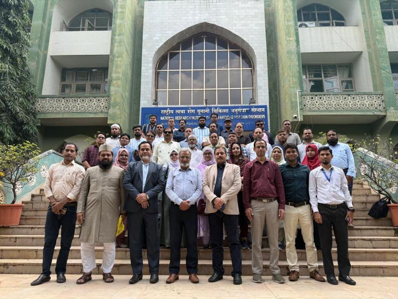 हैदराबाद। आयुष मंत्रालय भारत सरकार ने राष्ट्रीय त्वचा रोग यूनानी चिकित्सा अनुसंधान संस्थान हैदराबाद द्वारा दिनांक 13-10-25 से 18-10-25 तक क्लिनिकल प्रैक्टिस गाइडलाइंस इन यूनानी मेडिसिन फॉर मेटाबॉलिक एंड डर्मेटोलॉजिकल डिसऑर्डर पर 6 दिवसीय कार्यशाला का आयोजन किया गया। जिसमे पूरे भारत के अलग अलग राज्यो से 30 डॉक्टर्स ने हिस्सा लिया राजस्थान राज्य से अन्य चिकित्सकों के साथ डा दयार नूरानी (वरिष्ठ चिकित्सा अधिकारी)ने राज्य का प्रतिनिधित्व किया कार्यशाला में 6 दिन तक अलग अलग राज्यो के विशेषज्ञों ने मेटाबॉलिक डिसऑर्डर्स पर नई रिसर्च,डेटा एनालिसिस,ट्रीटमेंट गाइडलाइन पर विस्तार से चर्चा की और विचारो का आदान प्रदान किया। कार्यक्रम का संयोजन प्रोफेसर डा मोहम्मद ज़ाकिर (रिसर्च ऑफिसर NRIUMSD ) ने किया इस अवसर पर पूरे 6 दिन NRIUMSD के डायरेक्टर डा यूसुफ इफ़्तिख़ार मुंशी मौजूद रहे। प्रोग्राम के समापन समारोह में तेलंगाना आयुष विभाग के डायरेक्टर श्री श्रीकांत बाबू प्रभु जी ने समस्त चिकित्सकों को संबोधित किया और अपने अपने क्षेत्र में ओबेसिटी और डायबिटीज़ पर काम करने पर ज़ोर दिया, अंत में समस्त भारत से आए समस्त विशेषज्ञों व चिकित्सकों को सर्टिफिकेट व मोमेंटो देकर सम्मानित किया।